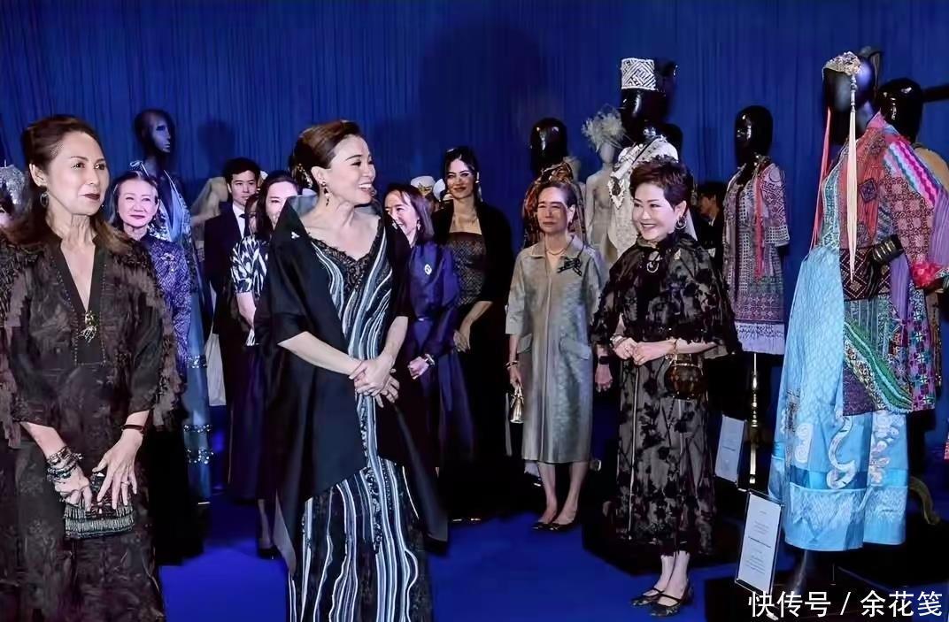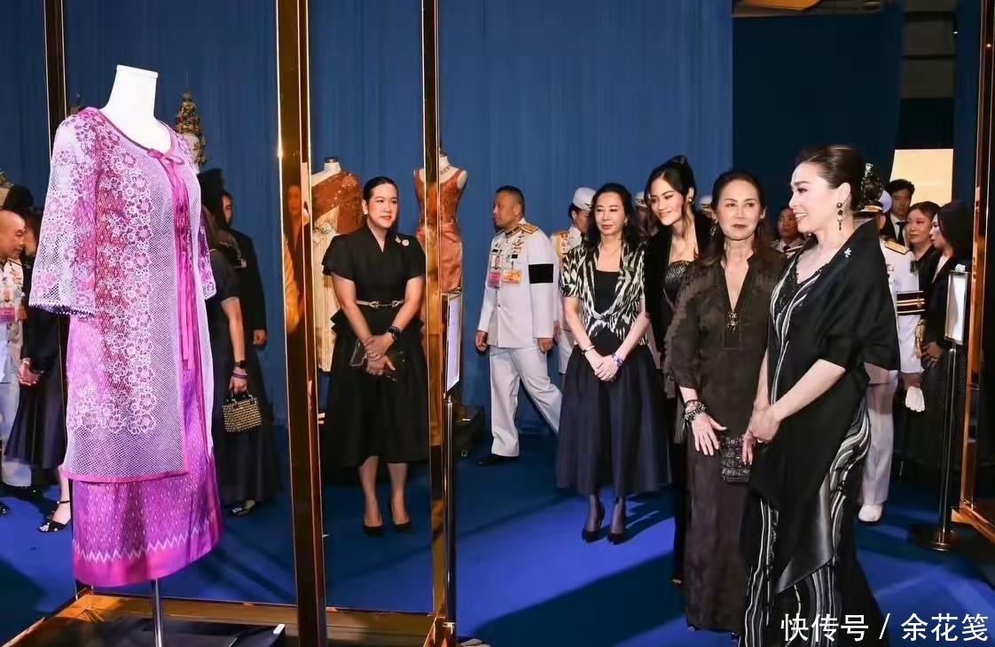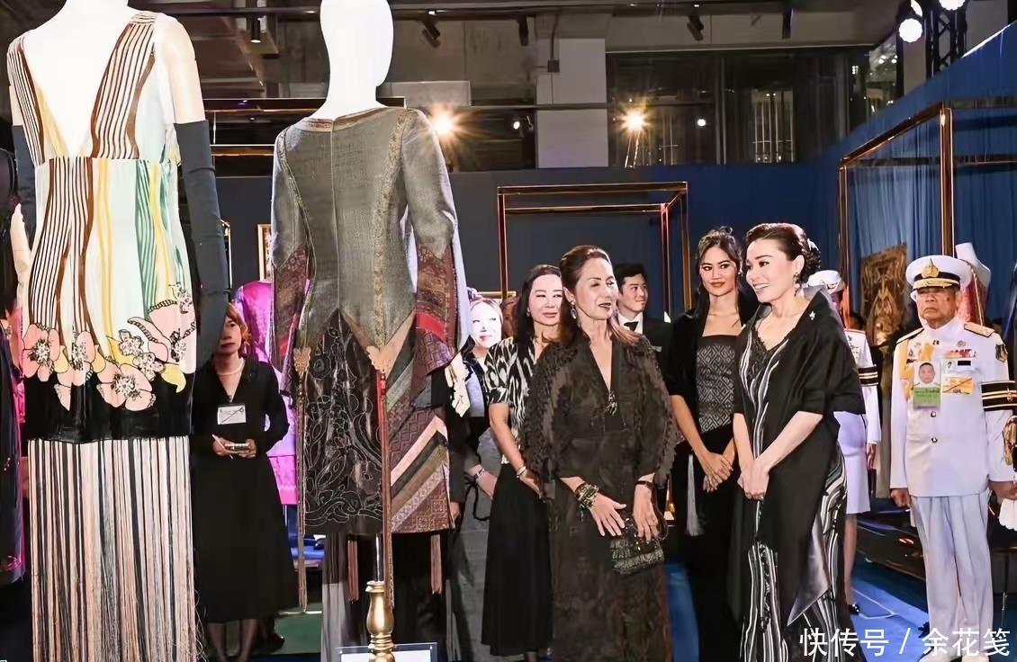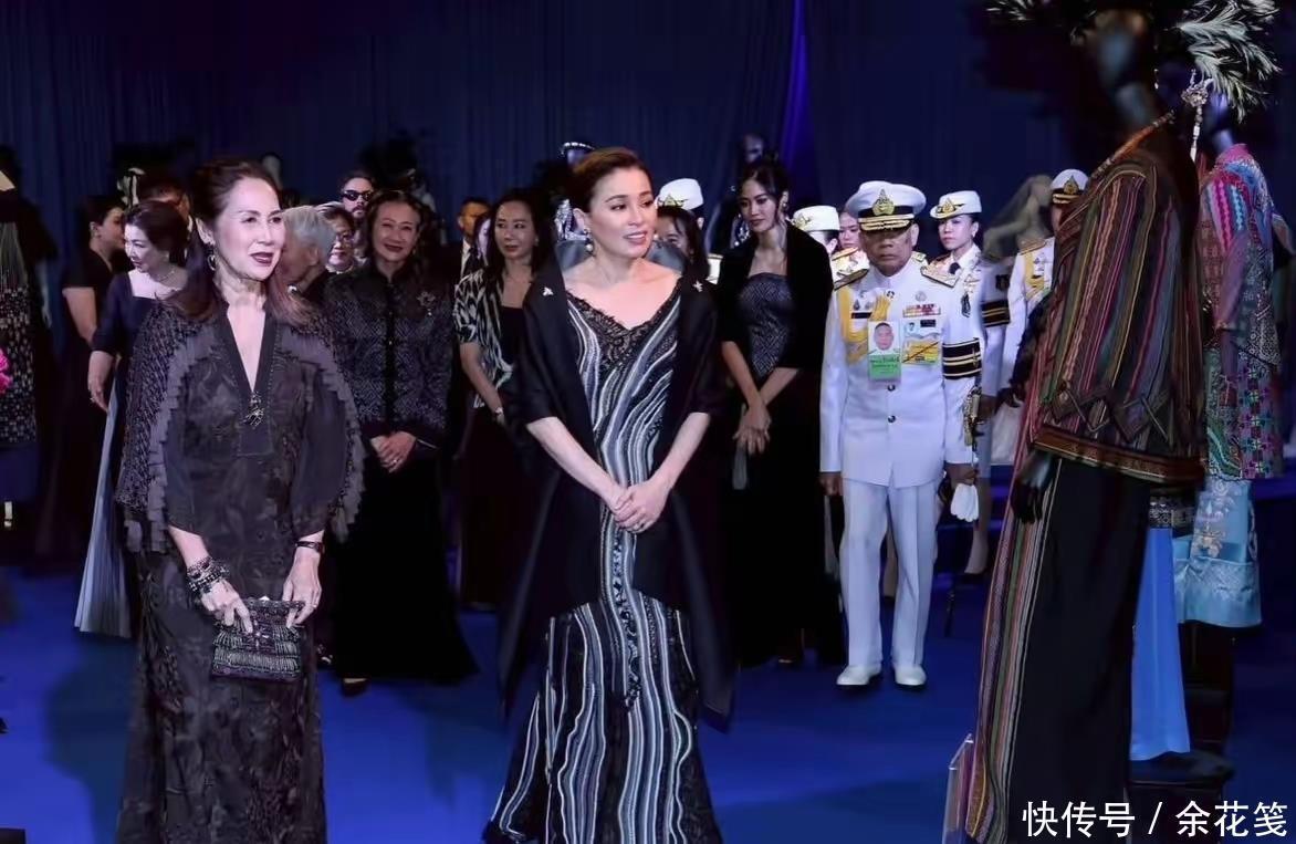 王后这一身看展服装,上面是深V镂空绣花造型,对中年妇女很友好,设计师本人妆容和造型赏心悦目,款款小富婆本人的既视感。泰国王室公务多如牛毛,后宫女人们的服装和化妆品费用支出惊人,这位泰国本土设计师,服务于两任王后,她除了能力之外,也深得王室信任。