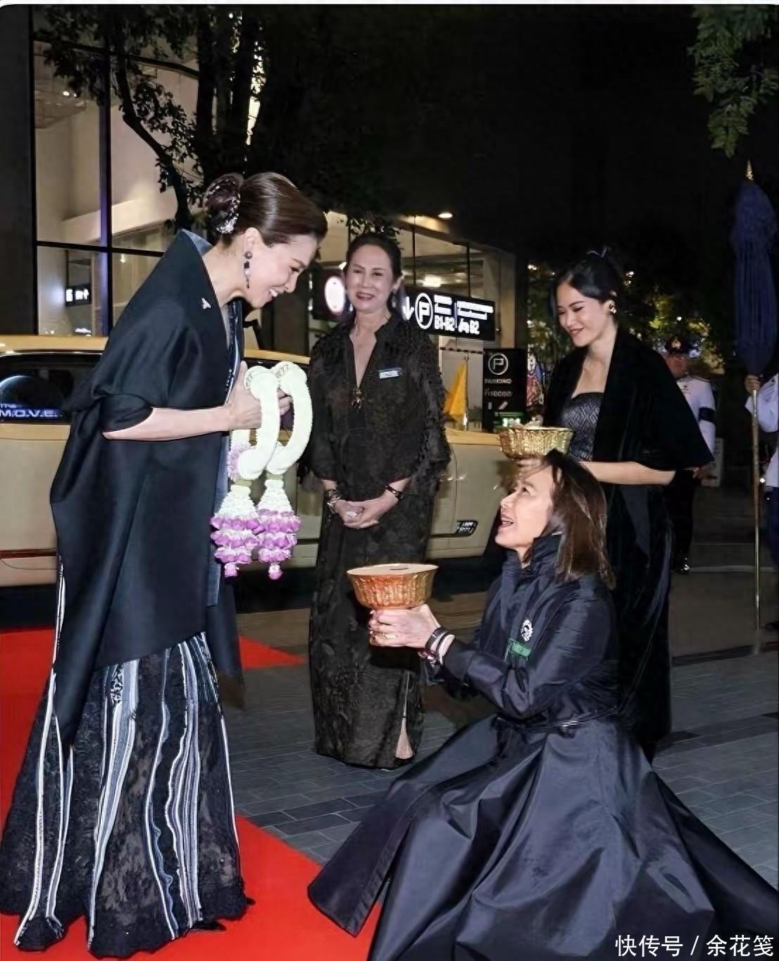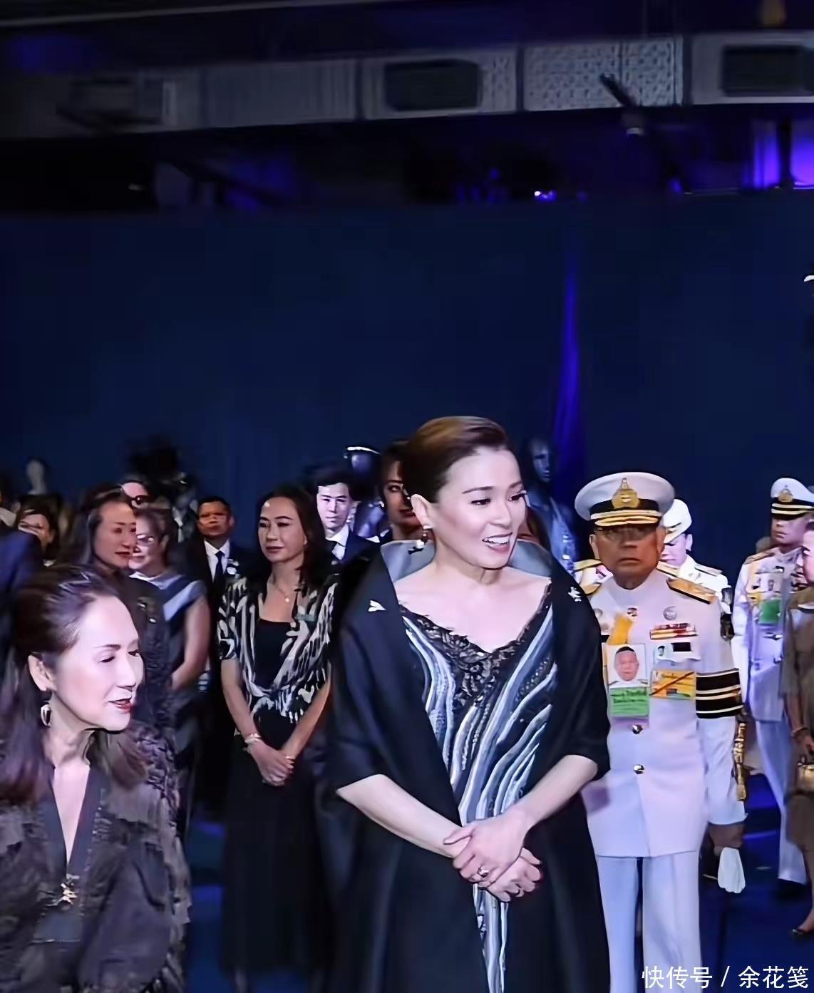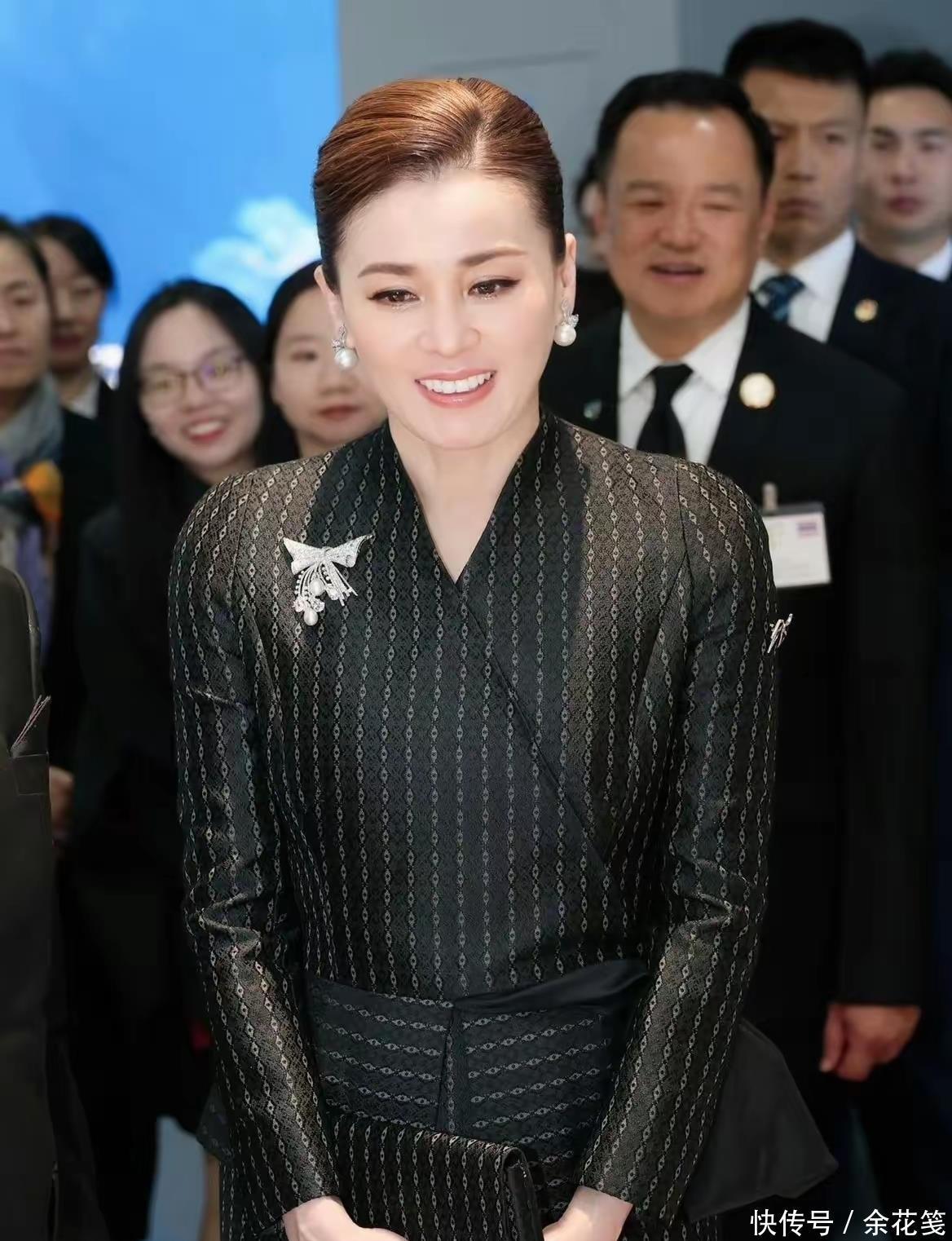 王后这一身看展服装,上面是深V镂空绣花造型,对中年妇女很友好,设计师本人妆容和造型赏心悦目,款款小富婆本人的既视感。泰国王室公务多如牛毛,后宫女人们的服装和化妆品费用支出惊人,这位泰国本土设计师,服务于两任王后,她除了能力之外,也深得王室信任。